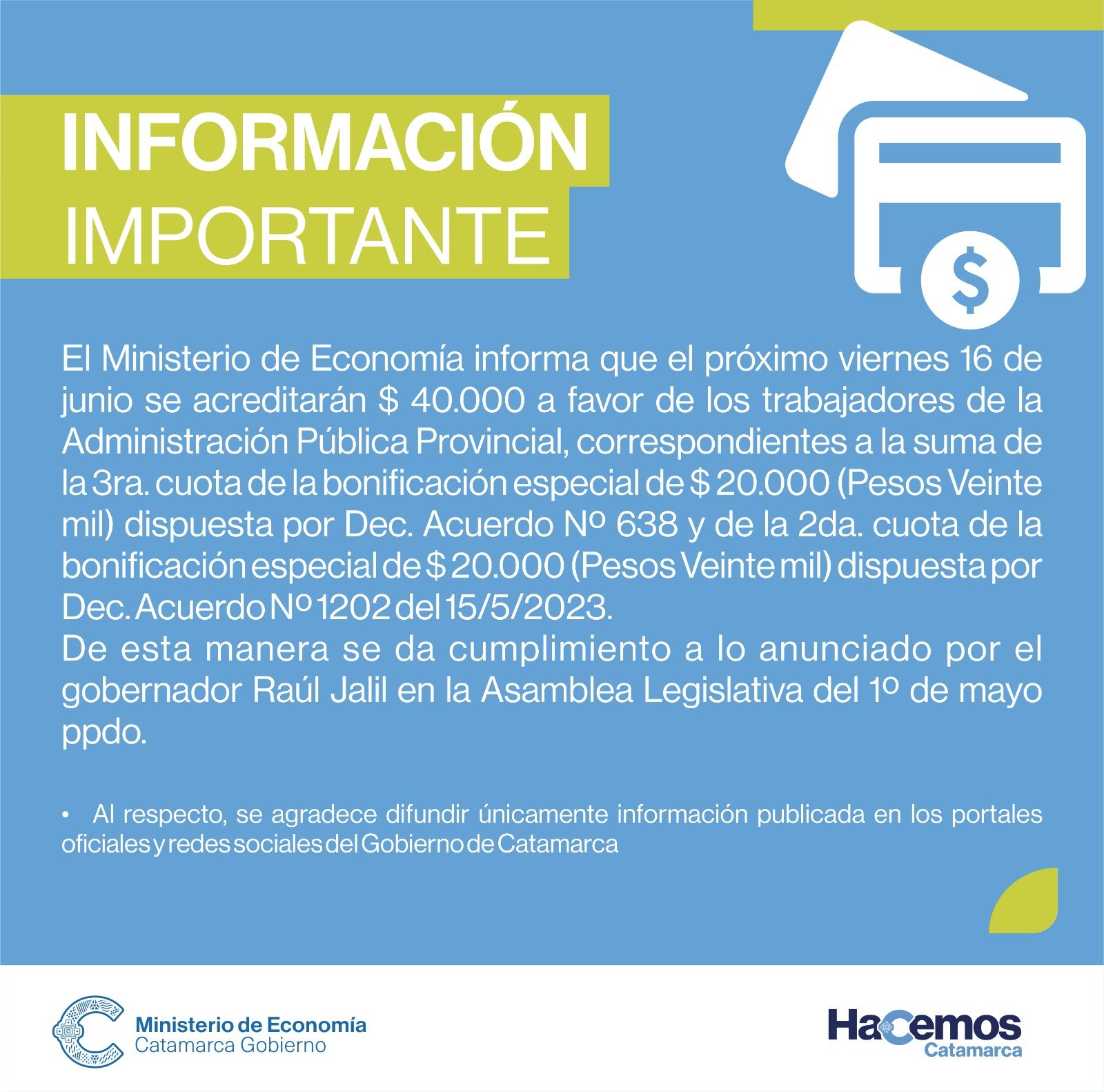El Ministerio de Economía informa que el próximo viernes 16 de junio se acreditarán los $40.000 a favor de los trabajadores de la Administración Pública Provincial, correspondientes a la suma de la 3ra. cuota de la bonificación especial de $20.000 (dispuesta por Decreto Acuerdo Nº 638) y de la 2da. cuota de la bonificación especial de $20.000 (dispuesta por Decreto Acuerdo Nº 1202 del 15/5/2023).