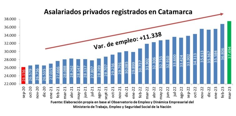 La cifra significativa para Catamarca es que, desde septiembre de 2020 que se tocó el piso del valor mínimo del empleo (pandemia mediante) a marzo de 2023, el crecimiento de asalariados en el sector privado fue de 11.338 trabajadores registrados más.