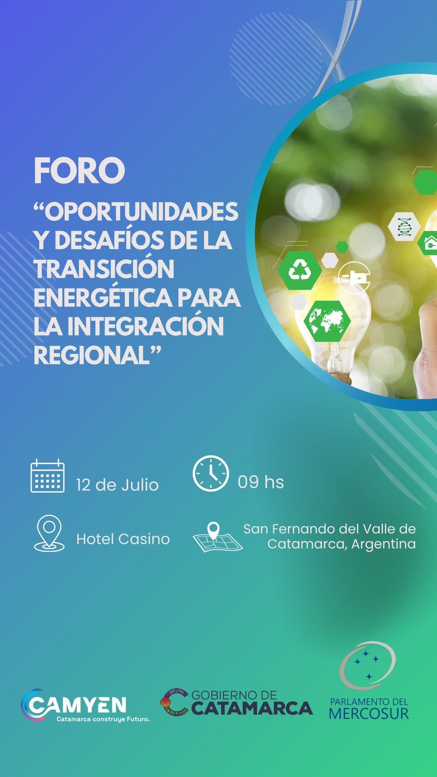 El próximo viernes 12 de julio, Catamarca será el epicentro de un nuevo encuentro de Parlamentarios del Parlasur, que se centrará en el Foro de Transición Energética titulado “Oportunidades y Desafíos de la Transición Energética para la Integración Regional”. El evento reunirá a parlamentarios y destacados invitados para debatir sobre la transición energética y sus implicancias en la integración regional.