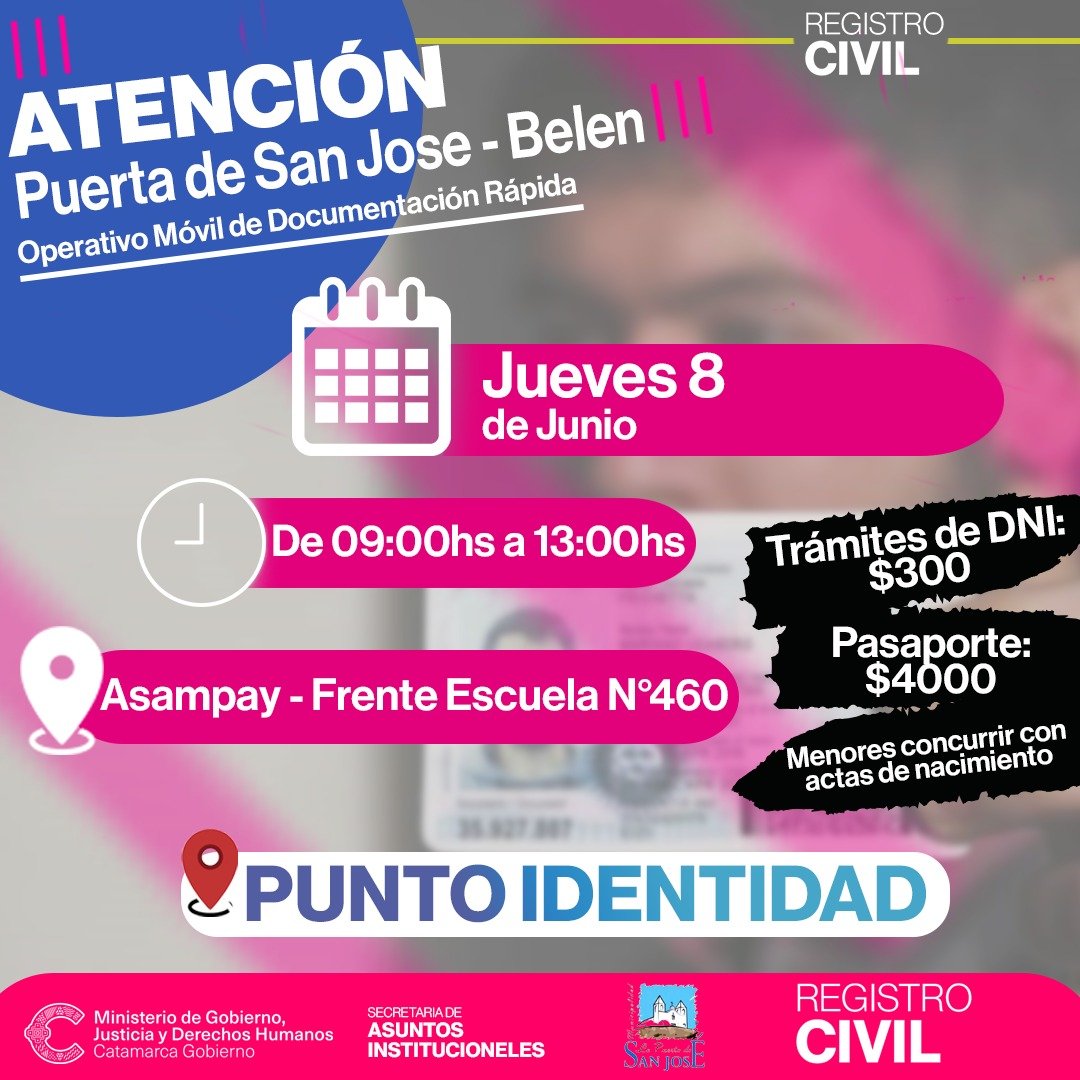 El jueves 8, el Registro Civil llegará a la localidad de Asampay, donde atenderá trámites y consultas de 9 a 13 y de 15 a 18 horas, el móvil del organismo se ubicará en las instalaciones del Complejo Agua Clara, la Puerta de San José, para mayor comodidad de los vecinos que necesiten hacer sus trámites y consultas de DNI.